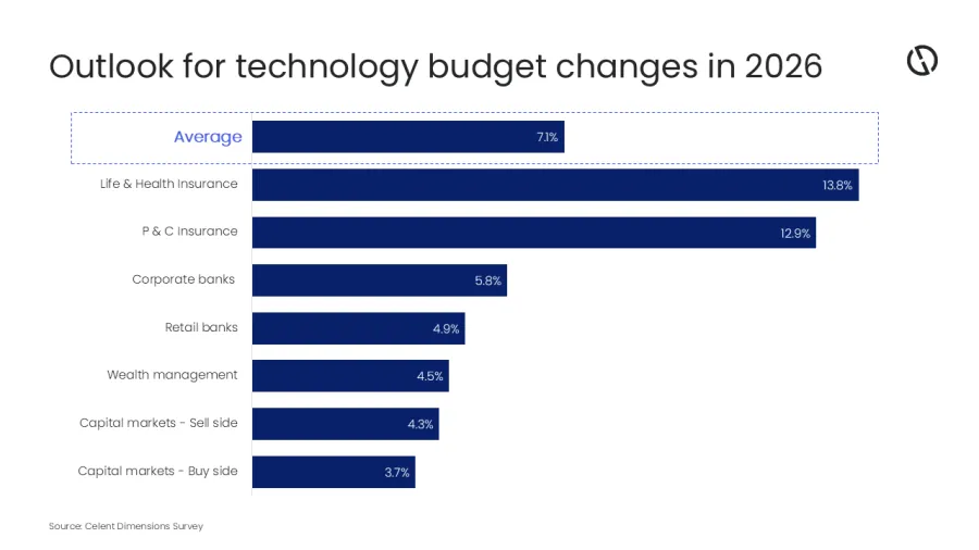 IT budgets are expected to increase by 7% in 2026 with significant variation across the financial services industry, according to Celent’s survey of over 1,000 executives from financial services firms.