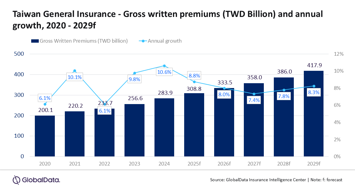 Taiwan’s general insurance industry is expected to grow at a compound annual growth rate (CAGR) of 7.9%, reaching $13.1b (TW$417.9b) in gross written premiums (GWP) by 2029, up from $9.7b (TW$308.8b) in 2025, according to GlobalData.