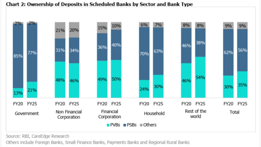 Private-sector banks in India have steadily increased their share of household deposits, rising from 30% in fiscal year 2020 (FY 2020) to 35% in FY 2025.